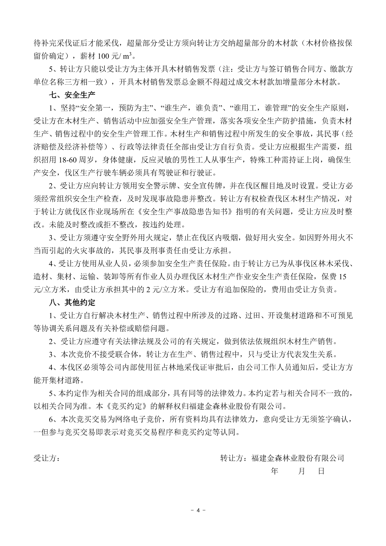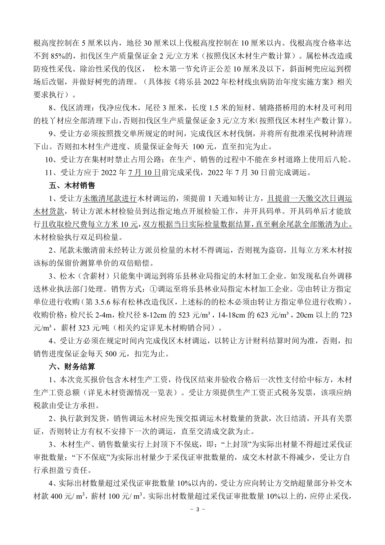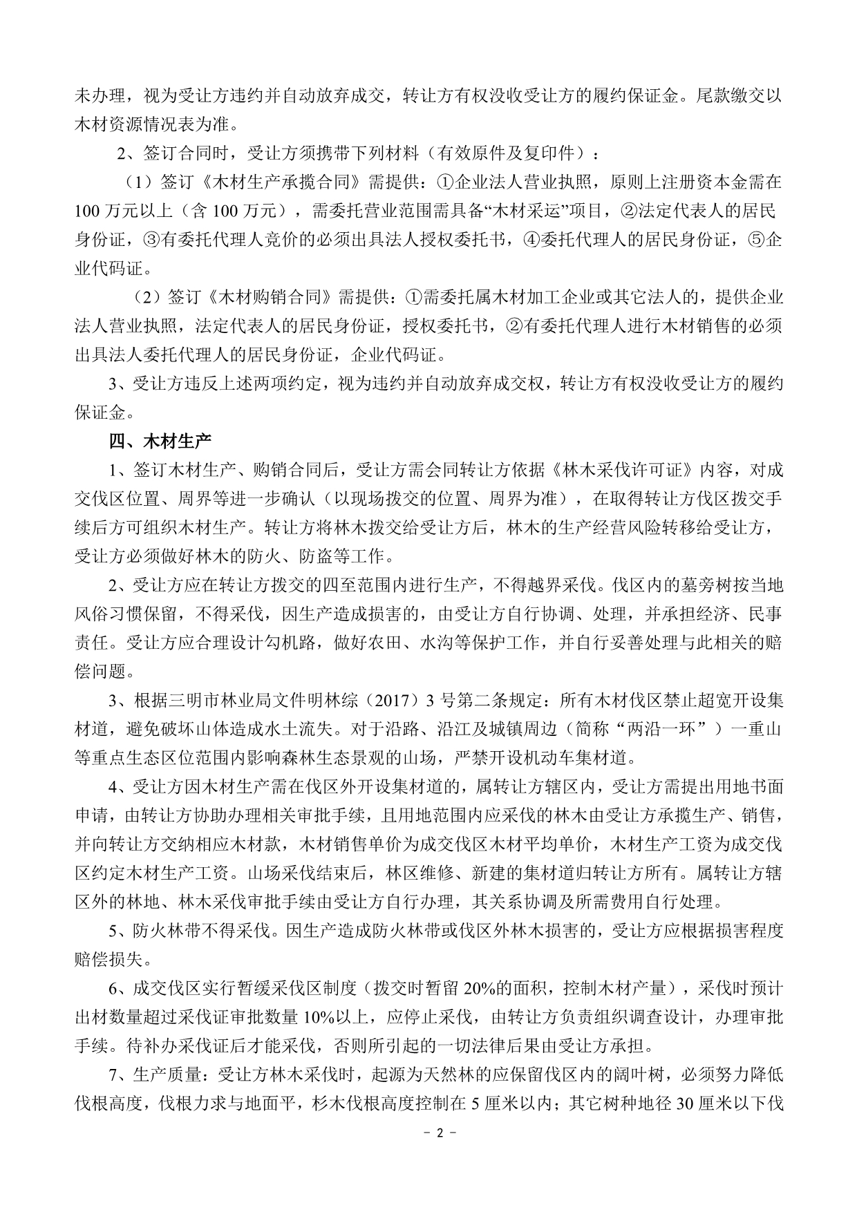 重要信息披露 | 1、標(biāo)的簡介所列的出材量等數(shù)據(jù)僅供參考,標(biāo)的以現(xiàn)狀交付,轉(zhuǎn)讓方及交易中心不承擔(dān)標(biāo)的面積與實(shí)測(cè)面積、標(biāo)的出材量與實(shí)際出材量差異等責(zé)任,不調(diào)整相應(yīng)的成交價(jià)格。 2、本次競(jìng)買報(bào)價(jià)包含木材生產(chǎn)工資,木材生產(chǎn)工資總額詳見木材資源情況一覽表,待伐區(qū)結(jié)束并驗(yàn)收后一次性支付給受讓方。 3、銷售費(fèi)用、成交后發(fā)生的政策變化費(fèi)用、稅收均由受讓方承擔(dān)。 4、松木(含薪材)只能集中調(diào)運(yùn)到將樂縣林業(yè)局指定的木材加工企業(yè)。如發(fā)現(xiàn)私自外調(diào)的,將移送林業(yè)執(zhí)法部門處理。銷售方式:①調(diào)運(yùn)至將樂縣林業(yè)局指定木材加工企業(yè)。②由轉(zhuǎn)讓方指定單位進(jìn)行收購(第3.5.6標(biāo)中有松木改造伐區(qū),上述標(biāo)的的松木必須由轉(zhuǎn)讓方指定單位進(jìn)行收購)(相關(guān)約定詳見木材購銷合同)。 5、受讓方應(yīng)于2022年7月10日前完成采伐,2022年7月30日前完成調(diào)運(yùn)。 6、本次交易第1標(biāo)和第2標(biāo)木材運(yùn)輸需經(jīng)過木材建造的花橋,限載4m,同時(shí),第1標(biāo)伐區(qū)道路開設(shè)需經(jīng)過軍用光纜,道路開設(shè)時(shí)應(yīng)避開。第4標(biāo)寺許村伐區(qū)運(yùn)輸需經(jīng)過高速公路底下涵洞,限高限載6m3,吳厝地村伐區(qū)道路開設(shè)需經(jīng)過電站的水管。一旦參與交易表明意向受讓方已認(rèn)可并接受該風(fēng)險(xiǎn),由該風(fēng)險(xiǎn)產(chǎn)生的一切后果和費(fèi)用由意向受讓方承擔(dān)。 7、未盡事宜詳見木材資源情況一覽表、競(jìng)買約定、木材生產(chǎn)承包合同(范本)、木材購銷合同(范本)、伐區(qū)位置示意圖等本公告其他附件。 | ||